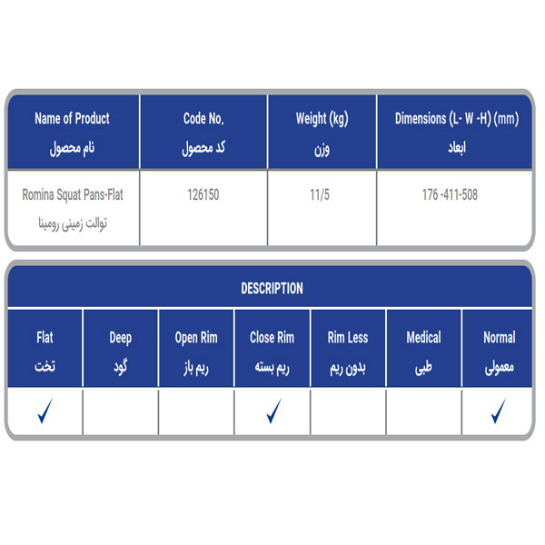 | ابعاد توالت ایرانی | عرض 41.1 طول 50.8 ارتفاع 17.6 |