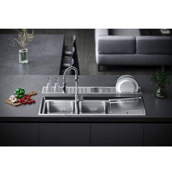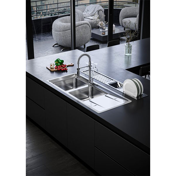 سینک توکار بیمکث مدل 4406 از انواع سینک توکار محسوب میشود و در دسته سینکهای فانتزی قرار میگیرد. این سینک ظرفشویی دارای دو لگن و یک سینی است. جنس سینک استنلس استیل 304 است. ابعاد سینک 52*120 سانتیمتر و عمق لگن آن 24 سانتیمتر است. مدلهای مرغوب سینک های استیل درخشش خاصی دارند. ویژگی منحصر به فرد این سینک عمق 4 سانتی متری سینی آن است که نظافت و کاربری سینک را بسیار ساده میکند. ابعاد برش صفحه 485*1165 میلیمتر است.