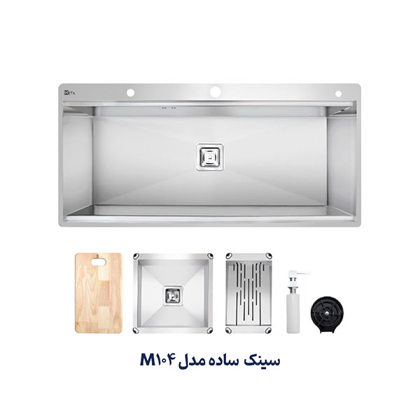 سینک توکار متا مدل M104 دارای یک لگن است. ابعاد سینک 50*104 سانتیمتر و عمق لگن آن 25 سانتیمتر است. قبل از خرید سینک باید به فضای نصب آن توجه داشت و سینکی با ابعاد متناسب خریداری نمود. ضخامت ورق این سینک 1.2 میلیمتر است. این محصول دارای جامایع متصل بر روی سینک، لیوان شور،تخته گوشت، سبد میوه شور و لگن متحرک است.