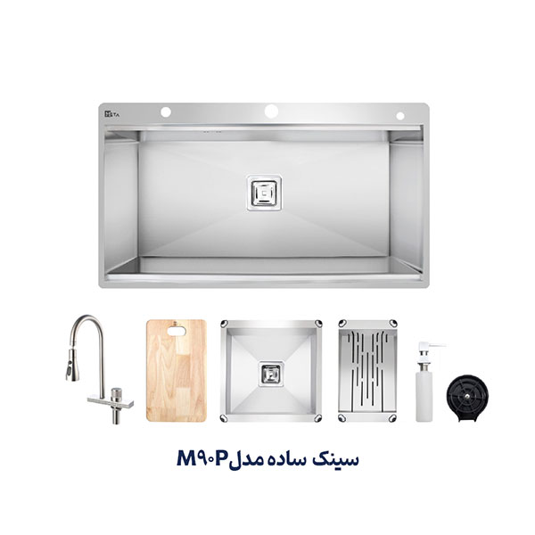 سینک توکار متا مدل M90P دارای یک لگن است. ابعاد سینک 50*90 سانتیمتر و عمق لگن آن 25 سانتیمتر است. قبل از خرید سینک باید به فضای نصب آن توجه داشت و سینکی با ابعاد متناسب خریداری نمود. ضخامت ورق این سینک 1.2 میلیمتر است. این محصول دارای جامایع متصل بر روی سینک، لیوان شور، تخته گوشت، میوه شور،لگن متحرک و شیر آبشاری است.