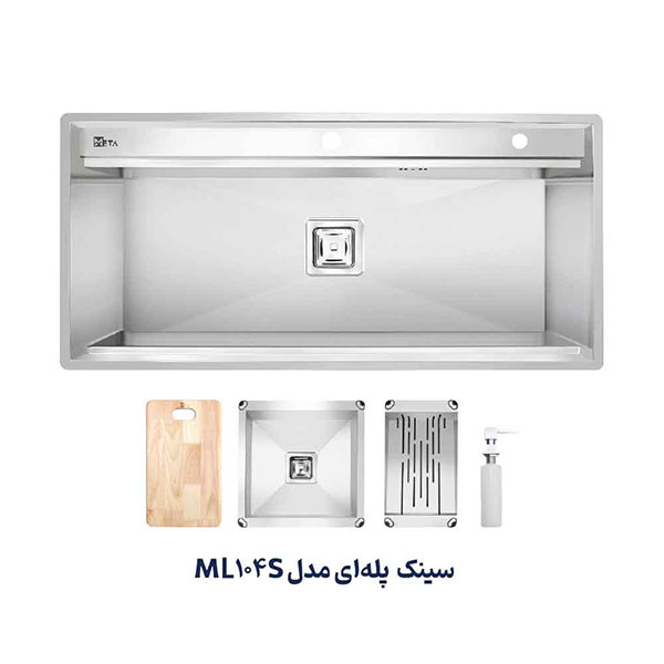 سینک توکار پله دار متا مدل ML104S دارای یک لگن است. ابعاد سینک 50*104 سانتیمتر و عمق لگن آن 25 سانتیمتر است. قبل از خرید سینک باید به فضای نصب آن توجه داشت و سینکی با ابعاد متناسب خریداری نمود. ضخامت ورق این سینک 1 میلیمتر است. این محصول دارای جامایع متصل بر روی سینک، تخته گوشت، میوه شور و لگن متحرک است. پله دار بودن این محصول از پاشش آب به بیرون از سینک و روی صفحه کابینت جلوگیری میکند و طول عمر صفحه را بالاتر میبرد.