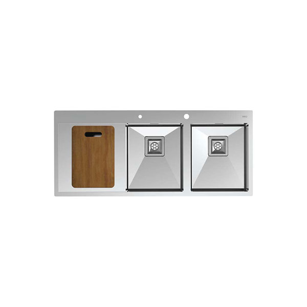 سینک توکار کن مدل BCN202 دارای دو لگن و یک سینی است. ابعاد سینک 50*116 سانتیمتر و عمق لگن آن 20 سانتیمتر است. از نکات مهم در طراحی این سینک گوشه های گرد R10 میباشد. قبل از خرید سینک باید به فضای نصب آن توجه داشت و سینکی با ابعاد متناسب خریداری نمود. ابعاد برش این محصول 1160*480 میلیمتر است و هم قابلیت نصب به صورت فلش مانت و تاپ مانت را دارد. ضخامت ورق این سینک 2 میلیمتر است. این محصول دارای جامایع متصل بر روی سینک و تخته کار چوبی است.