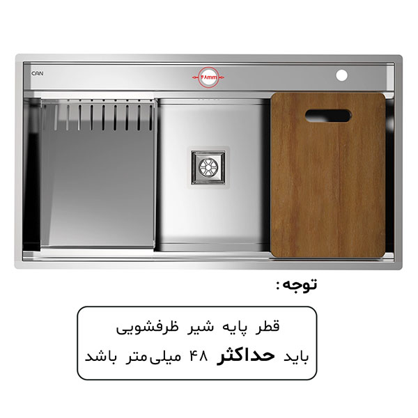 سینک کن مدل BCN304 دارای یک لگن است. این سینک در سه سایز با ابعاد 104*50 ، 90*50 ، 74*50 سانتیمتر تولید میشود و عمق لگن آن 23 سانتیمتر است. قبل از خرید سینک باید به فضای نصب آن توجه داشت و سینکی با ابعاد متناسب خریداری نمود. ضخامت ورق این سینک 1 میلیمتر است. این محصول دارای جامایع متصل بر روی سینک است. از دیگر مشخصات این سینک میتوان به سبد استیل و تخته گوشت اشاره کرد.