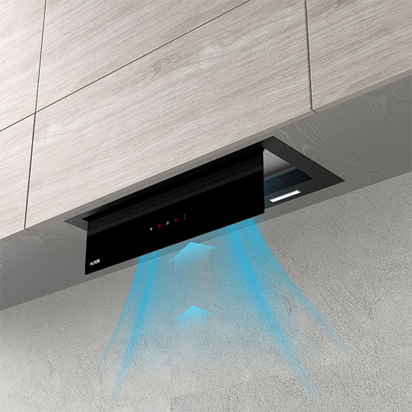 هود آلتون مدل H700B از انواع هود مخفی (توکار)به شمار میرود. روش نصب این نوع هود به گونهای است که داخل کابینت و در بالای اجاق گاز نصب میشود. نمای ظاهری هود شیشه مشکی کار شده است.