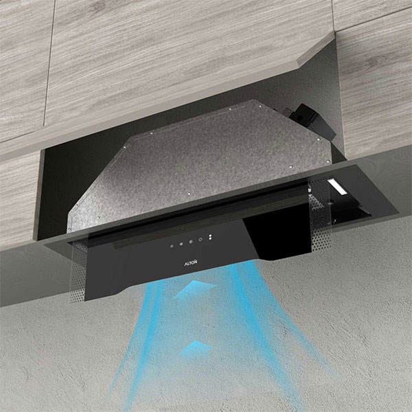 هود آلتون مدل H900B از انواع هود مخفی (توکار) به شمار میرود. روش نصب این نوع هود به گونهای است که داخل کابینت و در بالای اجاق گاز نصب میشود. نمای ظاهری هود شیشه مشکی کار شده است.
