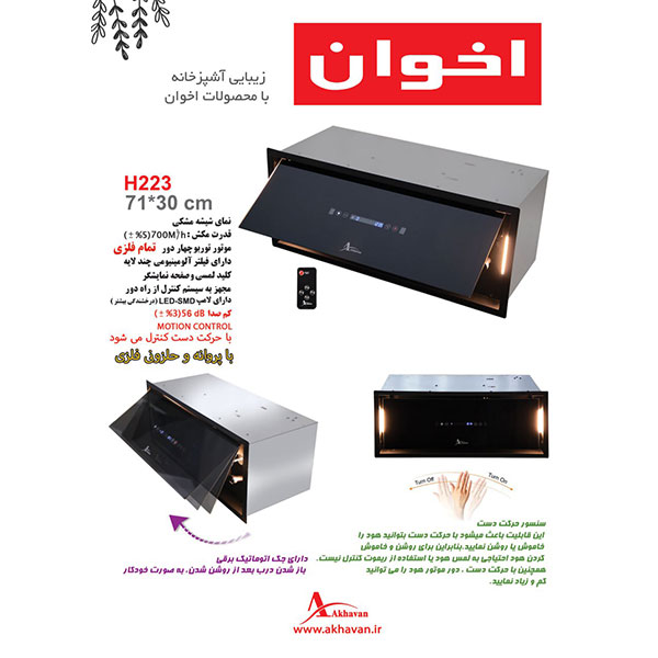 هود مخفی اخوان مدل H223 از انواع هود مخفی محسوب میشود. نمای هود شیشه مشکی کار شده است. عرض هود ۷1 و عمق آن ۳۰ سانتیمتر است. قدرت مکش هود ۷۰۰ مترمکعب بر ساعت و نوع موتور به کار گرفته شده در آن توربو با پروانه و حلزونی فلزی است. میزان صدای هود ۵۶ دسی بل است. هود مخفی اخوان مدل H222 دارای صفحه کلید لمسی است. در این نوع هود از فیلتر آلومینیومی چند لایه استفاده شده است که قابل شستشو میباشد. این نوع هود دارای ریموت کنترل است. نوع موتور این مدل فلزی میباشد. از دیگر ویژگیهای این مدل میتوان به روشنایی لامپ LED/SMD و نمایشگر LCD اشاره نمود. این هود با حرکت دست کنترل میشود (MOTION CONTROL). یکی از ویژگی های جالب این هود جک برقی آن است که هنگام روشن شدن هود به صورت اتومات و برقی باز میشود و همچنین مجهز به سنسور دود نیز میباشد.
