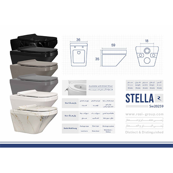 مکانیزم بسته شدن درب وال هنگ رسی مدل استلا از نوع آرامبند است. این نوع درها به صورت هیدرولیک بوده و دارای فنرهای مخصوصی هستند که از بسته شدن ناگهانی در توالت فرنگی جلوگیری میکند. آکس این وال هنگ 18 سانتی متر است و پیچ فلاش تانک توکار بر روی 18 سانتی متر قابل اجرا است . این بدان معنی است که فاصله دو جای پیچ پشت وال هنگ که به فلاش تانک توکار متصل می شود 18 سانتی متر است.